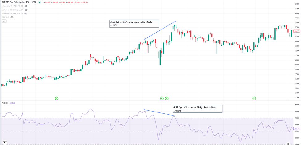 Ví dụ về phân kỳ âm RSI: