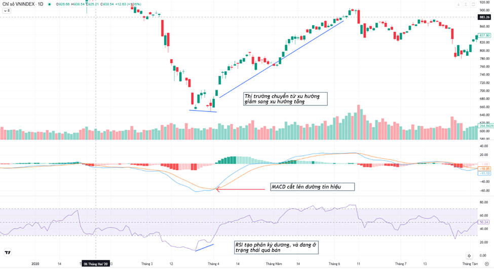 - Ví dụ: trong ví dụ ở dưới đây khi RSI tạo phân kỳ dương, MACD cắt lên trên đường tín hiệu, VNINDEX đã chuyển từ xu hướng giảm sang một xu hướng tăng. Kết hợp 2 chỉ báo này cho chúng ta những tín hiệu tin cậy hơn