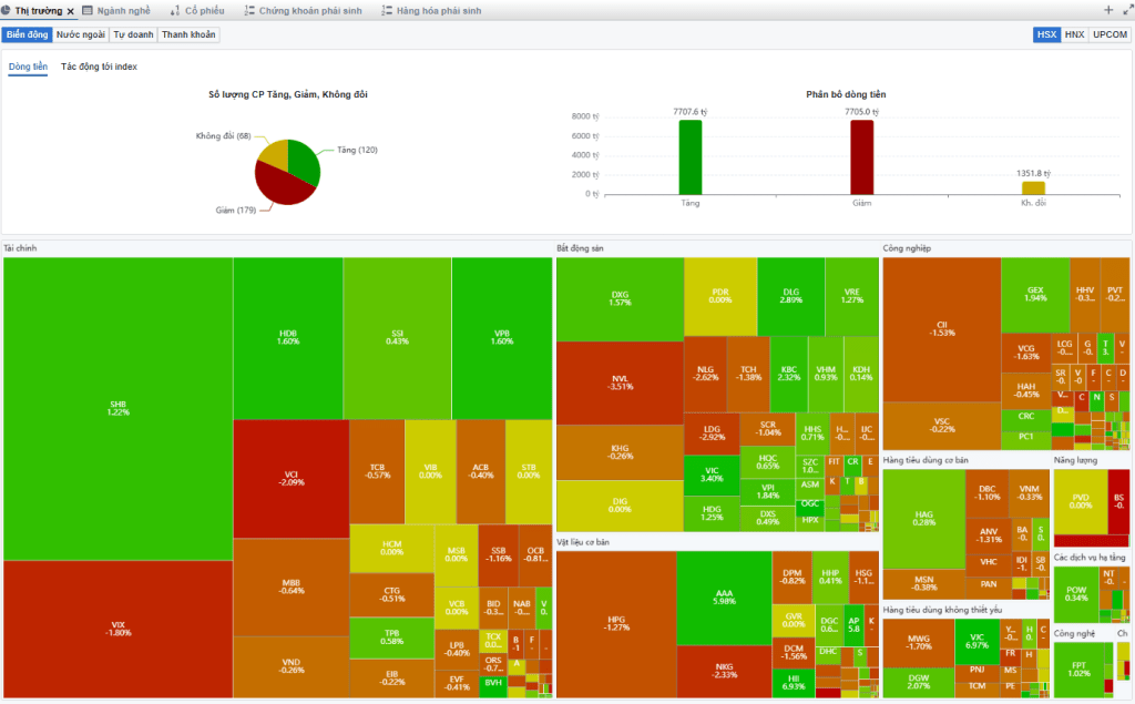 Độ rộng thị trường nghiên nhẹ về bên bán khi có 179 mã giảm giá so với 120 mã tăng giá. Về giá trị mua chủ động và bán chủ động lại ở mức khá cân bằng 7707 tỷ đồng mua chủ động so với 7705 bán chủ động.