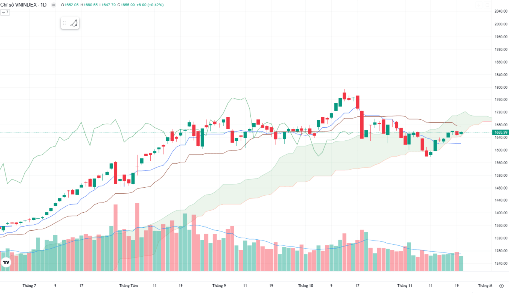 VNINDEX có phiên thứ 4 liên tiếp tích lũy thành công trên ma20, tạo nền giá với thanh khoản thấp và biên độ hẹp. Đây là sự vận động tích cực. Sự vận động đang đi khá sát với kịch bản mà tôi đã đưa ra trong bài phiên tích ngày 13/11. Xác xuât cao VNINDEX sẽ tiếp tục bò lên vùng 1690-1700 trong những phiên tới. Nếu thanh khoản tăng mạnh thì sẽ càng tích cực.
